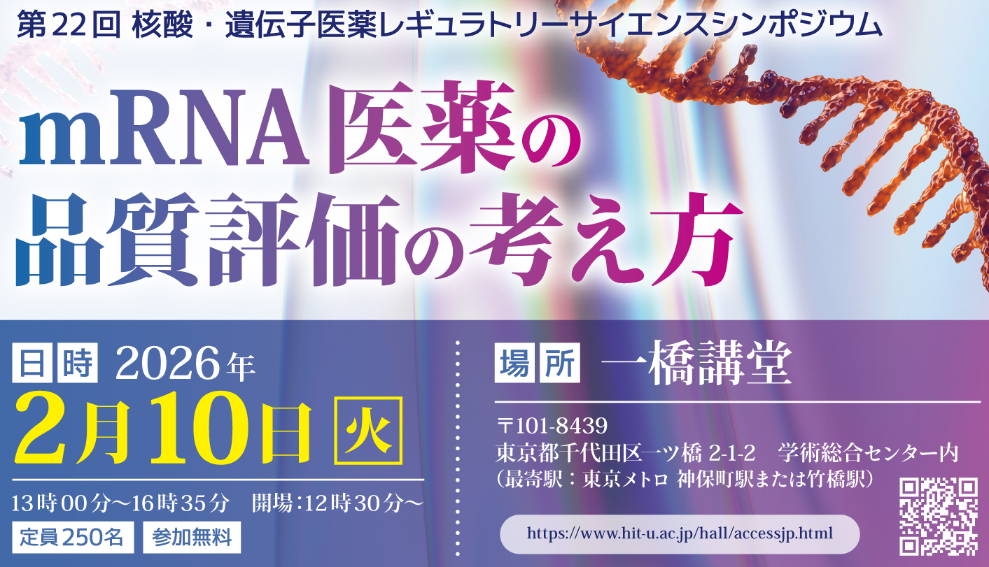 第22回 核酸・遺伝子医薬レギュラトリーサイエンスシンポジウム 「mRNA医薬の品質評価の考え方」 投稿日:2025.10.16 投稿者:日本核酸医薬学会