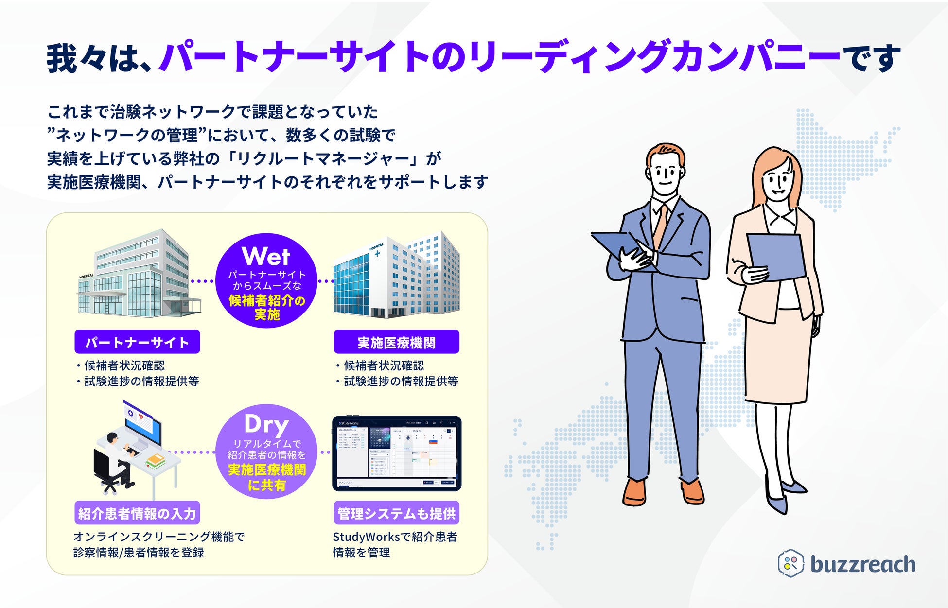 株式会社Buzzreachは、日本の治験・臨床研究における業務支援SaaS「StudyWorks」、患者リクルート支援基盤「Puzz」、そして全国737施設以上の治験協力医療機関と構築する「パートナーサイト」ネットワークを通じて、日本版DCTインフラを支えるヘルステックスタートアップ企業です。