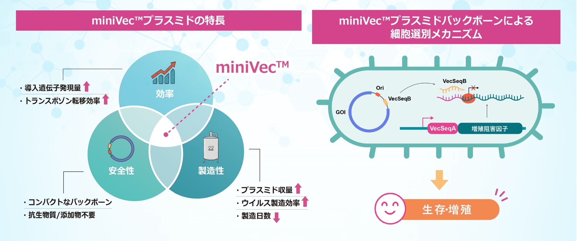 miniVec™の利点は、バイオ医薬品開発者に、GMP製造の円滑化、規制上のハードルの軽減、開発パイプライン全体の劇的なコスト削減など、直接的なメリットをもたらします。miniVec™ は高度な臨床応用を目的にデザインされたベクターシステムです。一過性トランスフェクション、エレクトロポレーション、ウイルスパッケージング、トランスポゾンおよびCRISPRを介したゲノム編集、naked DNAワクチンなど、幅広いin vitroとin vivo応用ができるようベクターシステムが揃い、従来のプラスミドシステムと同様の幅広い応用が可能です。
