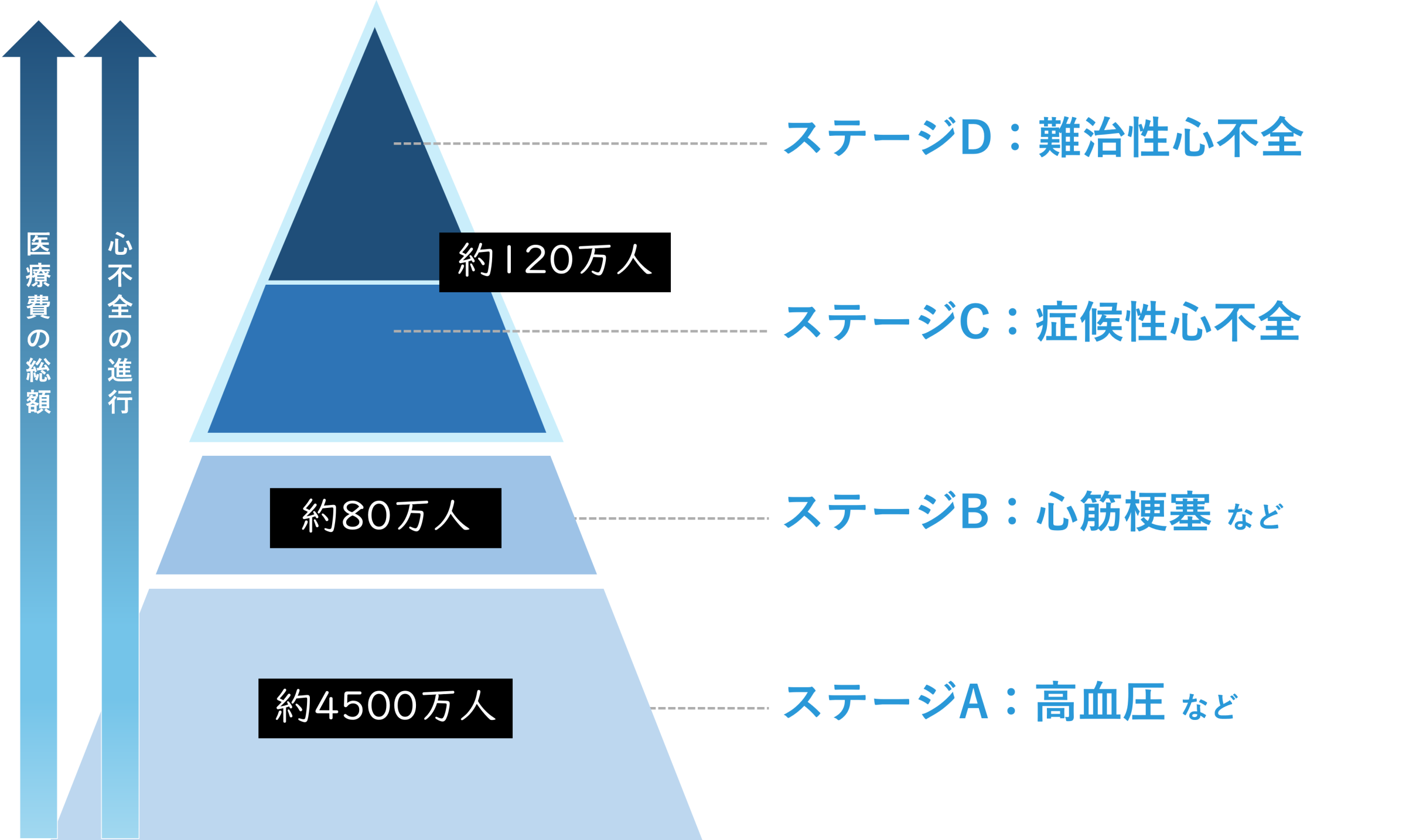 心不全は、全世界でその罹患者数が増加しており、「心不全パンデミック」とも呼ばれている重要な国民病です。個人の健康や医療現場に及ぼす影響に限らず、介護を含む医療費を逼迫することも指摘されています。