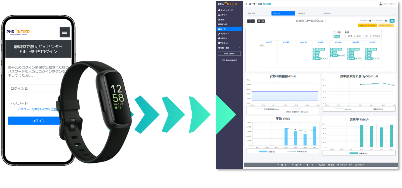 本研究を推進するにあたり全参加施設は当社の「PHRONTIER」を使用し、データ統括は静岡がんセンターが担当されます。ウェアラブルデバイスを含む多様なIoT(Internet of Things)機器から自動でデータを収集・統合管理できる機能を備えた「PHRONTIER」は、多施設共同研究で求められるデータの一元管理と、研究者・参加者の双方にとって直感的で使いやすいインターフェースが評価され、今回の採用に至りました。