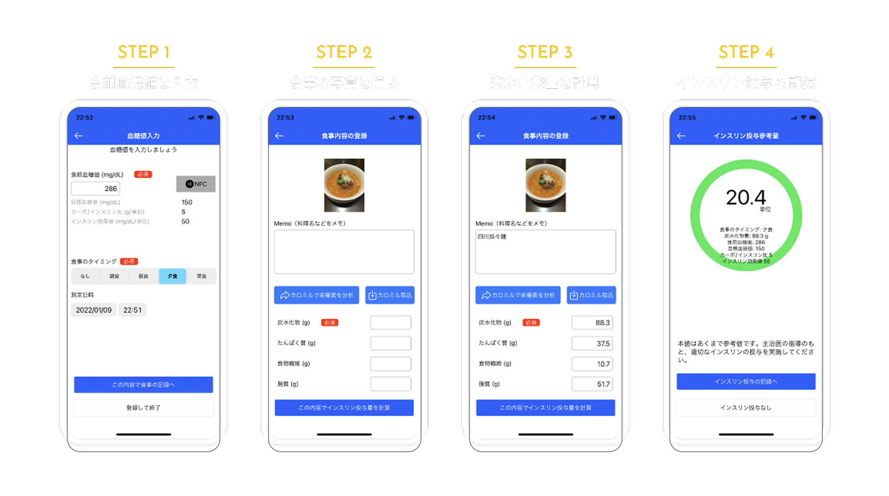AIカーボカウンターは、1型糖尿病患者の方々が日々の生活において適切なインスリン投与量を判定する研究用システムです。食事の写真からAIが摂取した炭水化物量を解析し、算出した数値からインスリン投与量の参考値を計算します。