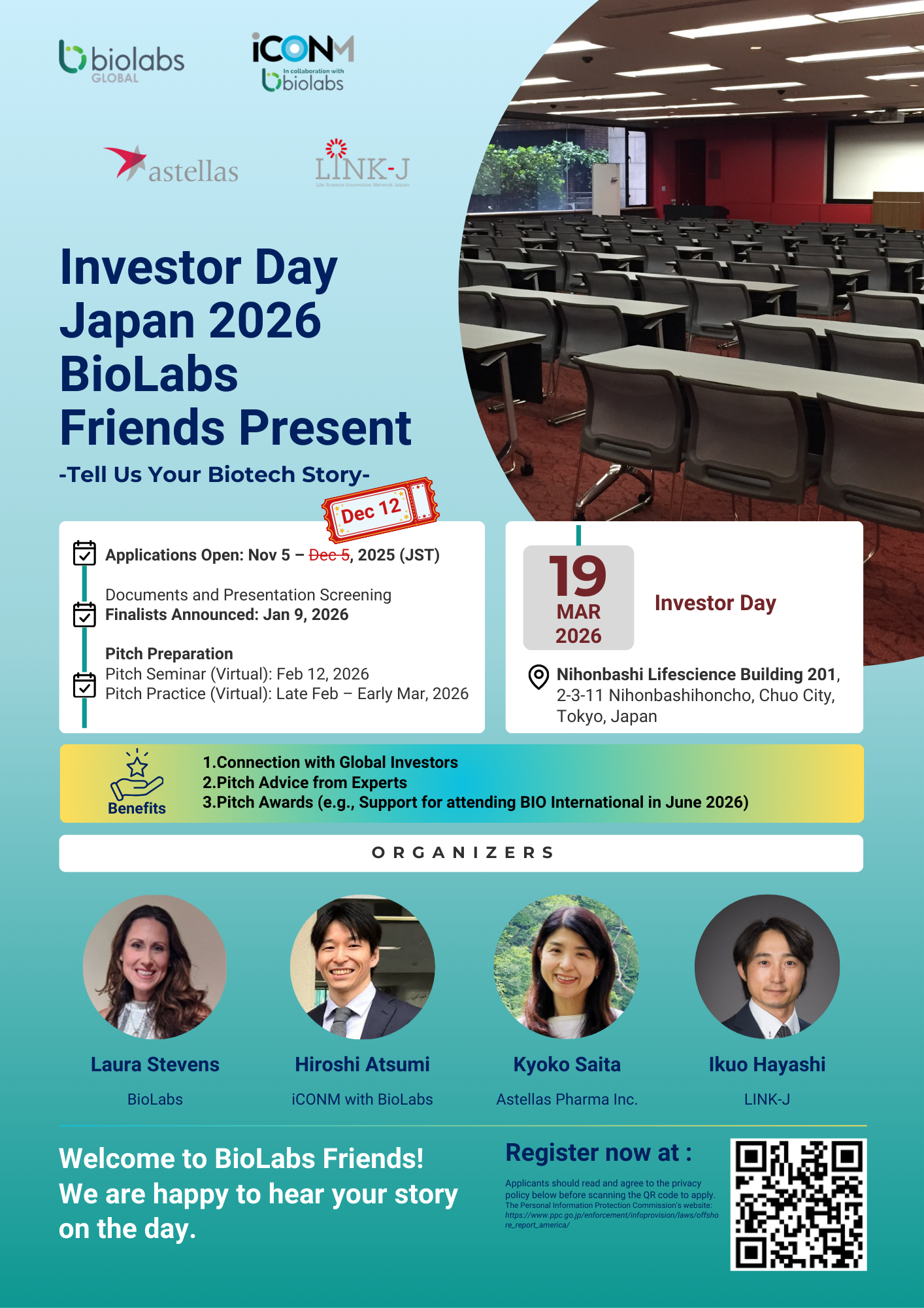 iCONM in collaboration with BioLabs、アステラス製薬株式会社、一般社団法人ライフサイエンス・イノベーション・ネットワーク・ジャパン(LINK-J)、および米国BioLabs社の四者が共催して、「Investor Day Japan 2026」を開催いたします。