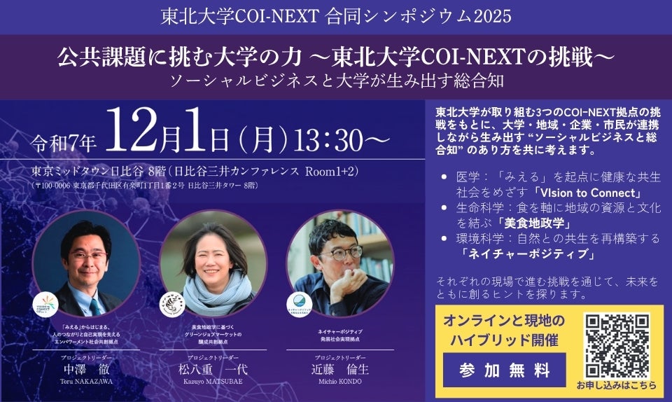 地域の課題、社会の分断、環境の変化 ― いま私たちは、複雑で多様な「公共課題」と向き合っています。このシンポジウムでは、東北大学が取り組む3つのCOIーNEXT拠点の挑戦をもとに、大学・地域・企業・市民が連携しながら生み出す“ソーシャルビジネスと総合知”のあり方を共に考えます。