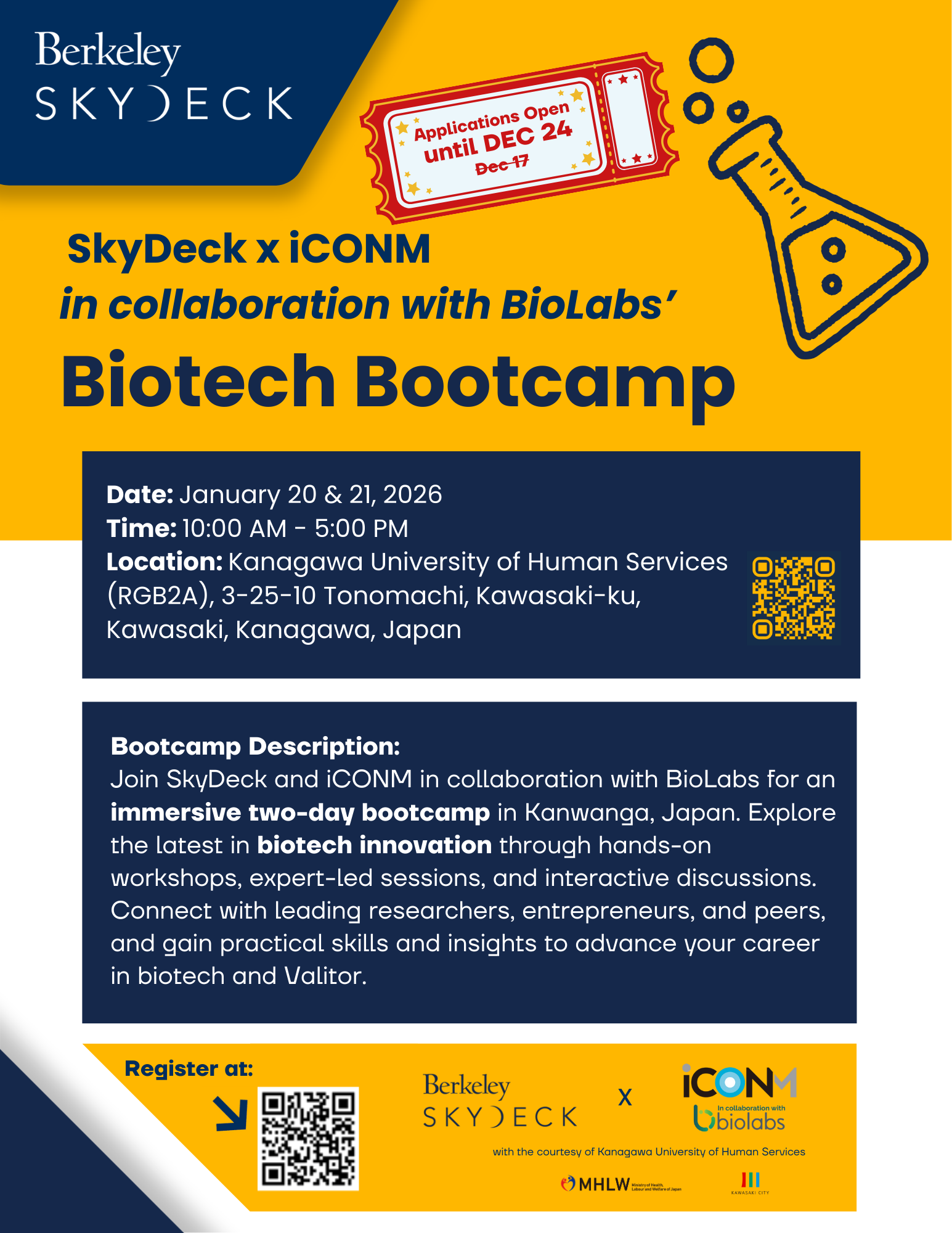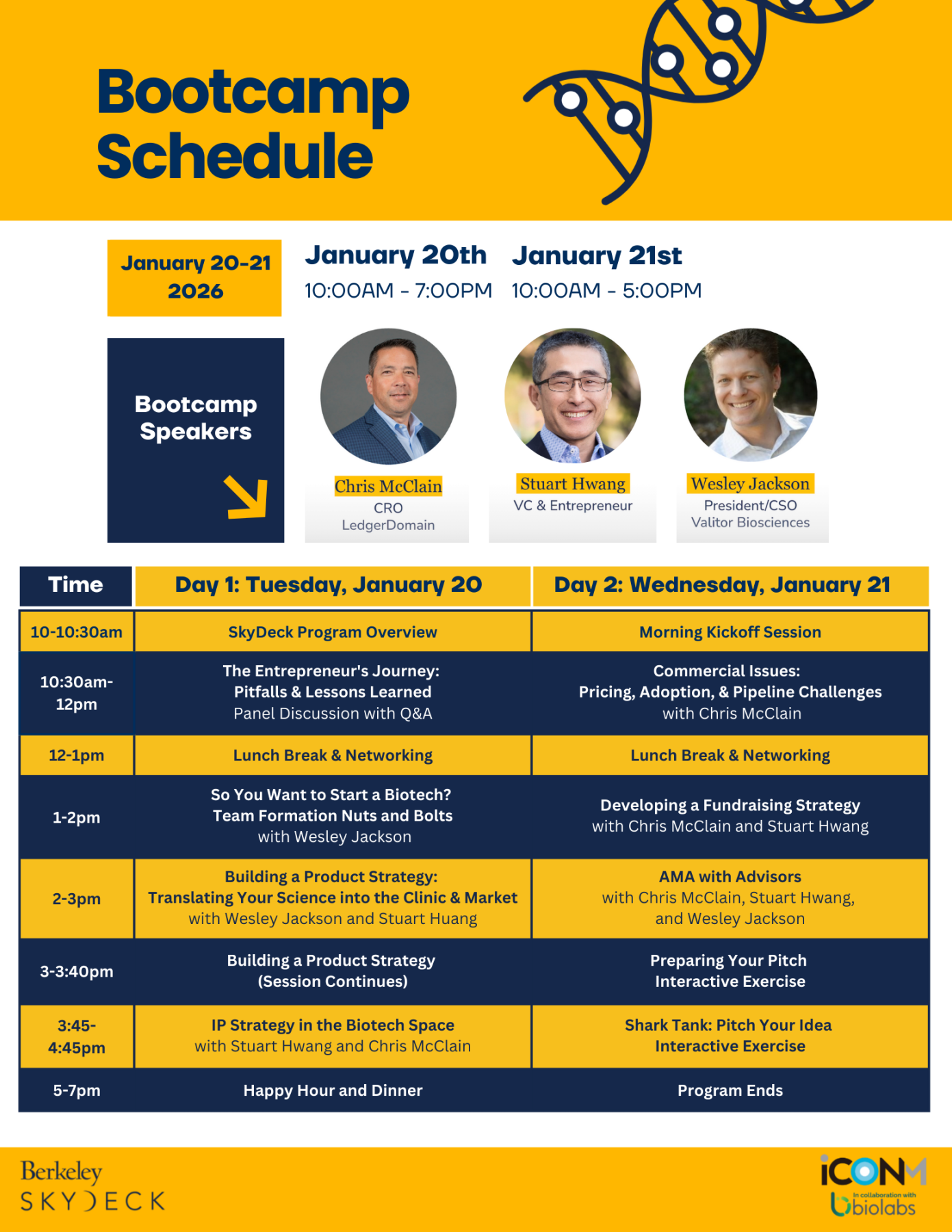 I’m excited to share an invitation to our upcoming two-day SkyDeck Biotech Bootcamp hosted by Berkeley SkyDeck and sponsored by iCONM in collaboration with BioLabs in Kanagawa, Japan.