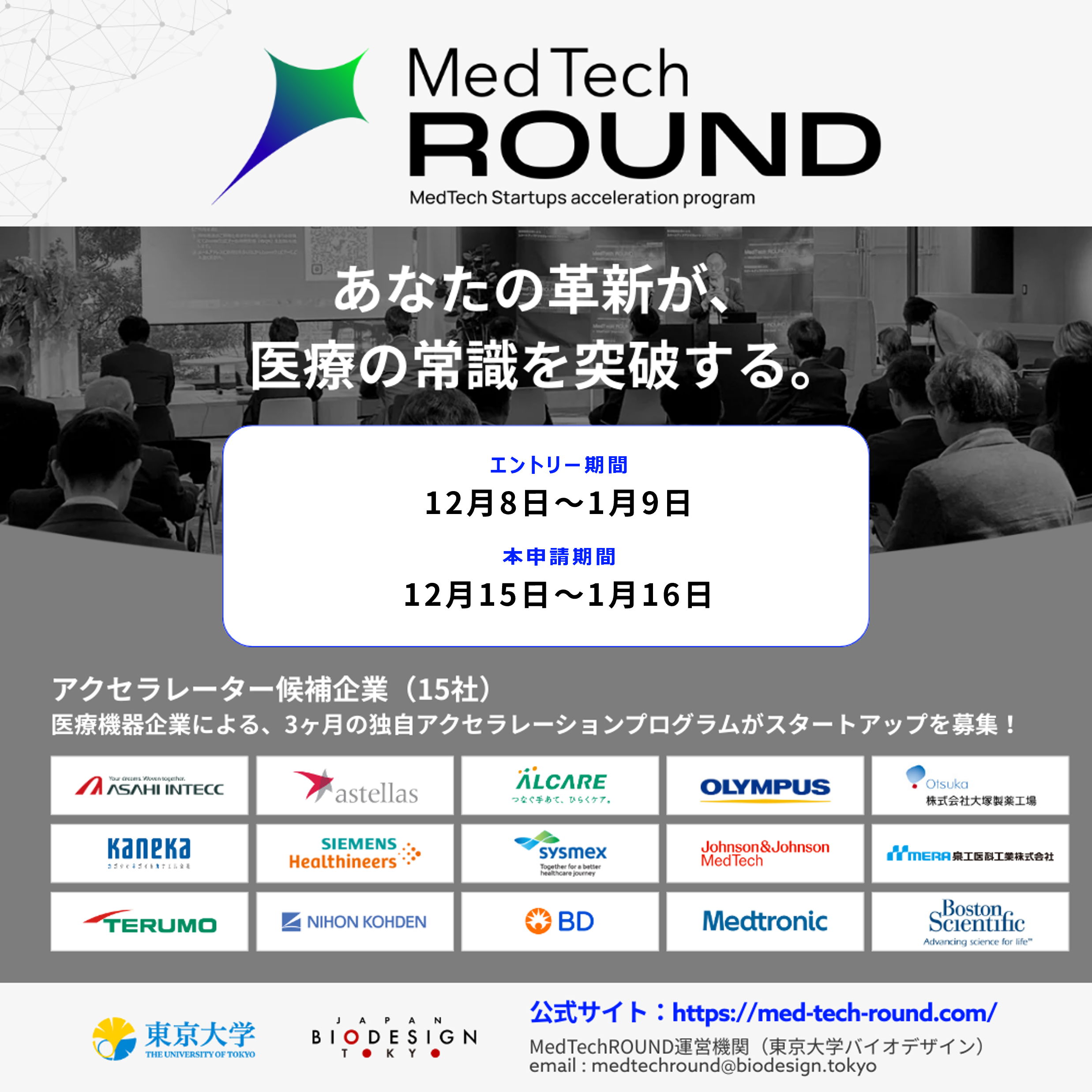 東京大学バイオデザインが、経済産業省と連携して運営する「MedTech ROUND」は医療機器・ヘルスケア分野における“スタートアップ × 大手企業”の協業・共創を支援するアクセラレーションプログラムです。