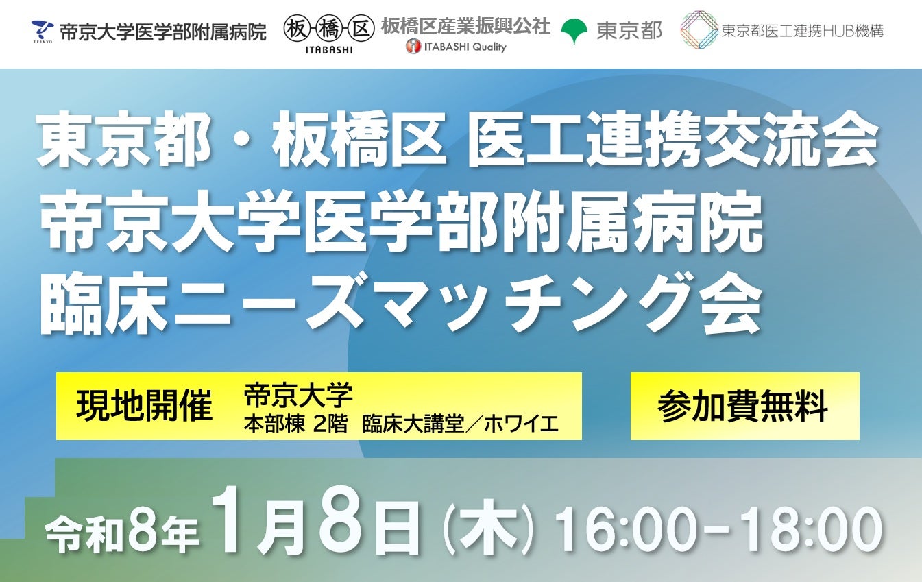 帝京大学医学部附属病院と東京都・板橋区の連携により、臨床ニーズマッチング会を開催します。医療現場でご活躍の先生方より医療機器開発につながる「お困りごと(ニーズ)」をご発表いただいた後、中小企業等との交流会を行います。臨床現場のニーズに基づき、医療機器メーカー・ディーラー、ものづくり企業、大学・研究機関の連携促進を目指します。