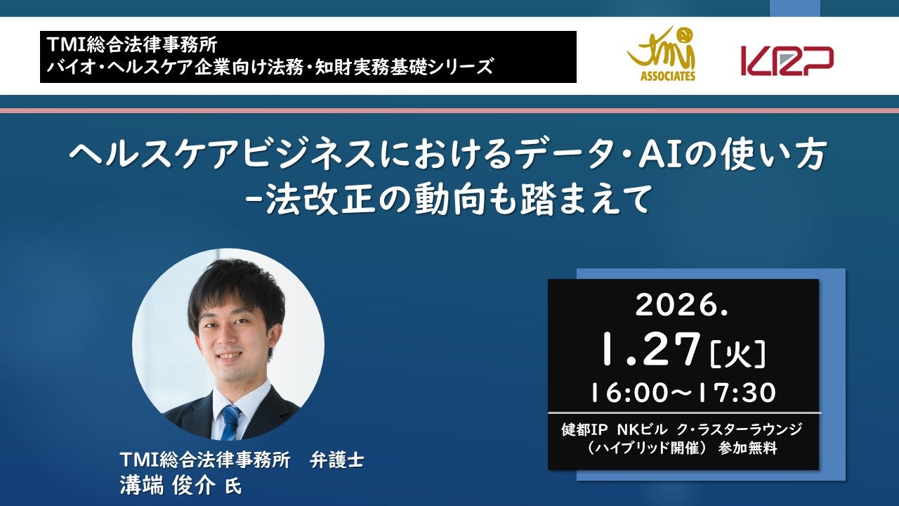 本セミナーでは、TMI総合法律事務所 溝端 俊介弁護士を講師に迎え、ヘルスケアビジネスに適用されるデータ関係の規制の全体像をわかりやすく説明したうえで、規制の解説にとどまらない、データ・AIの「使い方」を解説いただきます。みなさまのご参加をお待ちしております!