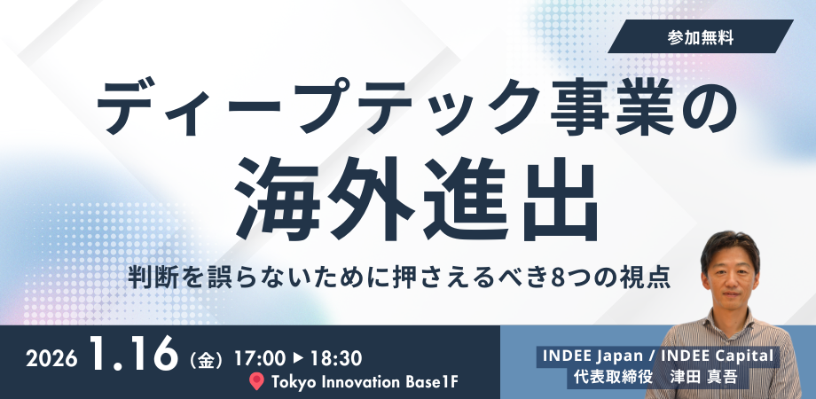 本セミナーでは、海外への事業展開を数多く支援してきた、株式会社インディージャパン 代表取締役/株式会社インディーキャピタル 代表取締役の津田が登壇。ディープテック事業が海外進出を検討する際に押さえておくべき「8つの視点」を、実体験と支援事例を交えて解説します。海外市場を選定・調査する際に意識すべきポイントから、現地のエコシステム、政府の支援制度、そして進出時の具体的な注意点まで。実践的な視点で徹底解説いたします。