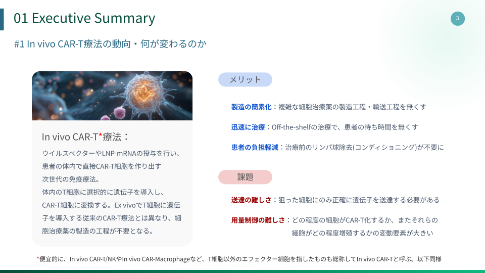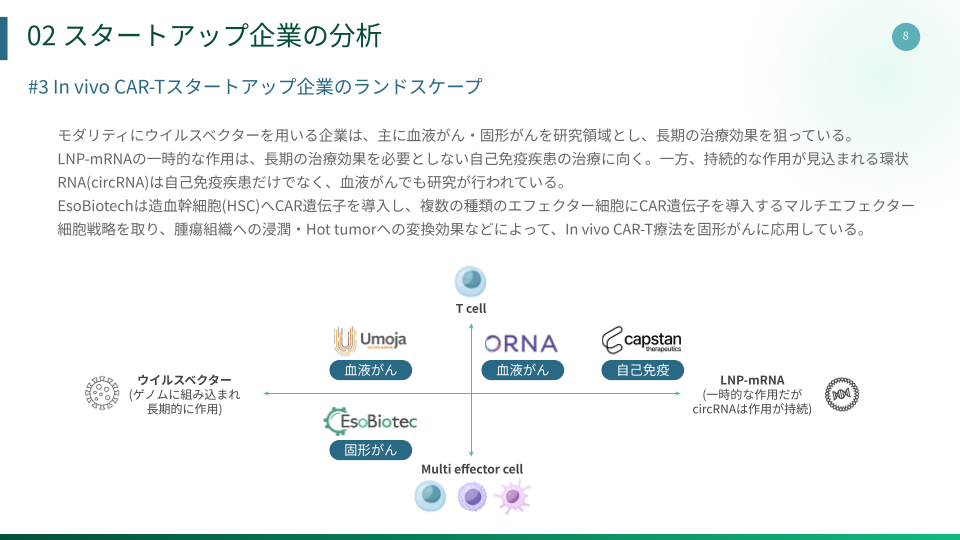 本レポートでは、世界38社のIn vivo CAR-T研究に取り組むスタートアップ企業の分析を通じて、以下の主要動向を明らかにしました。