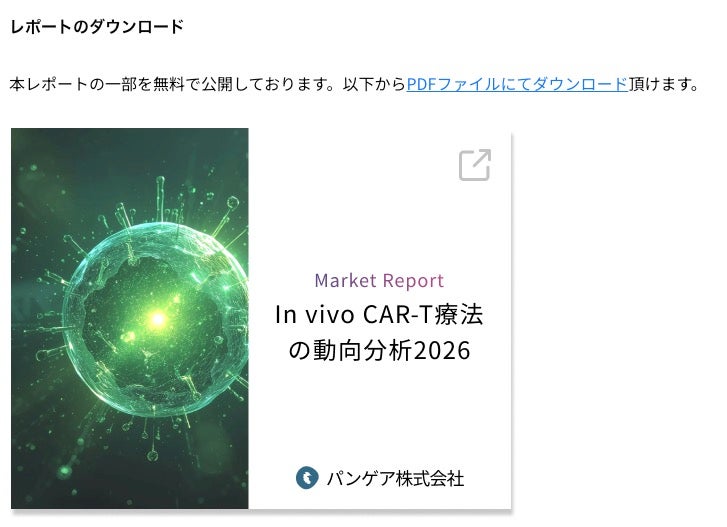 この度、パンゲア株式会社(本社:東京都中央区、代表取締役:米川雄基)は、次世代の遺伝子治療として注目を集める「In vivo CAR-T療法」に関する最新のマーケット調査レポート「In vivo CAR-T療法の動向分析 2026」を公表いたしました。