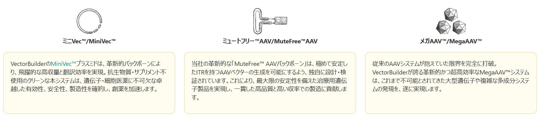 - 次世代デリバリーシステム:MiniVec™、MuteFree™AAV、MegaAAV™により、ペイロード容量や安定性の制約を打破し、大型遺伝子や複雑な多成分システムの発現を実現。