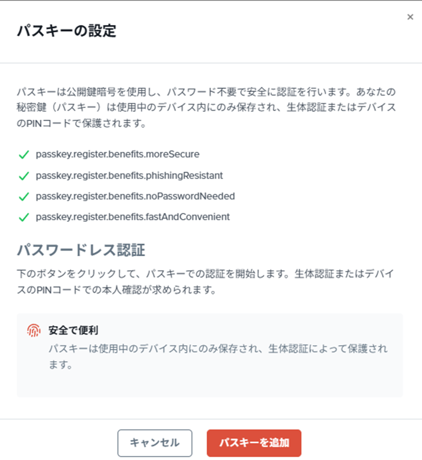 設定ページのマイアカウント>設定から、赤色の「新しいパスキーを追加」をクリックすることで、アカウントのパスキーを追加できます。