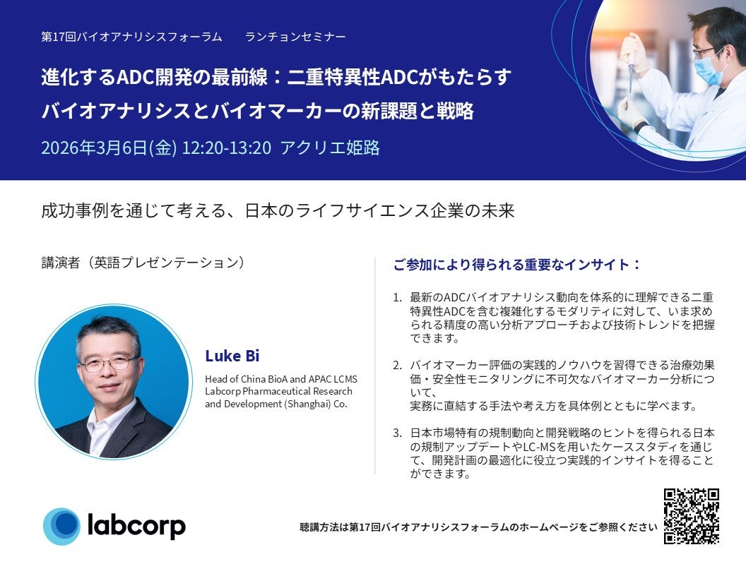 本セミナーでは、抗体薬物複合体(ADC)開発を加速する最新バイオアナリシスおよびバイオマーカー戦略について、成功事例を交えながらお話しします。