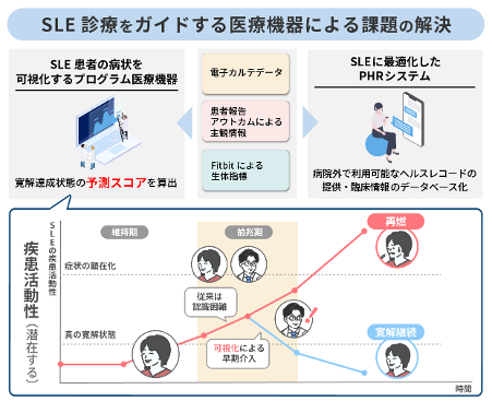本研究では、デジタルバイオマーカーを用いて、SLEの「疾患活動性」を定量的なスコアとして可視化し、診療を支援するプログラム医療機器の実現を目指します。