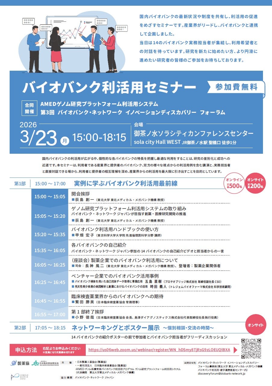 2026年3月23日(月)、「バイオバンク利活用セミナー(合同開催:第3回 バイオバンク・ネットワーク イノベーションディスカバリー フォーラム)」を開催いたします。
