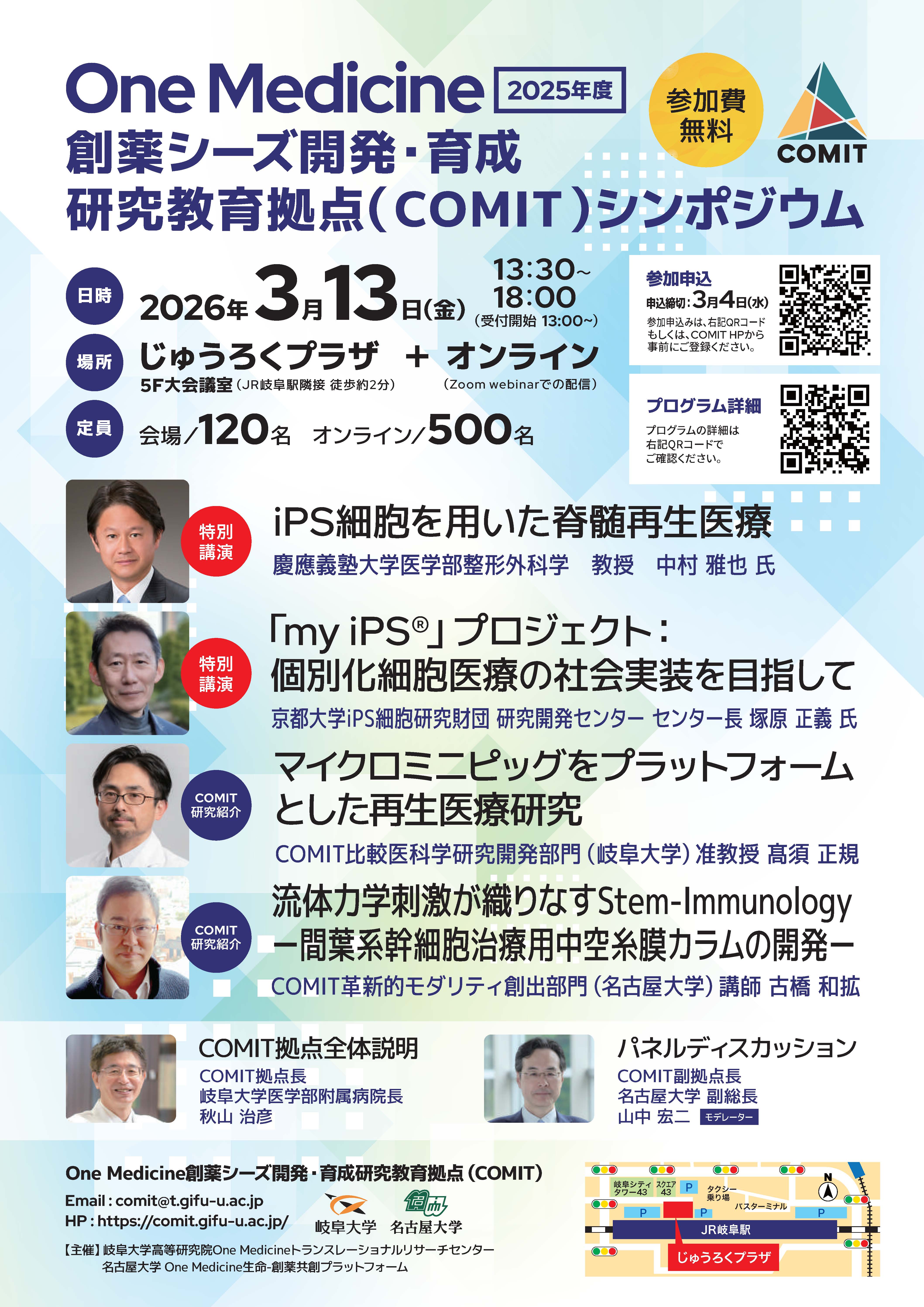 本シンポジウムでは、再生医療分野を軸とした本拠点の研究者ならびにプロジェクト等における研究開発の進捗状況を紹介いたします。また、特別講演として、慶應義塾大学医学部整形外科 中村 雅也教授による「iPS細胞を用いた脊髄再生医療」及び京都大学iPS細胞研究財団 研究開発センター 塚原 正義センター長による「「my iPS®」プロジェクト:個別化細胞医療の社会実装を目指して」を予定しており、特別講演者も含めたパネルディスカッションも企画しております。そのほか、創薬リサーチマネジメント人材実践的育成プログラム修了式、令和6年度創薬シーズ共同研究助成に採択された課題の研究概要等を紹介するポスターセッションもございます。