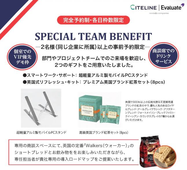 現地でのブース面談を同一企業複数名で事前予約いただいたお客様には、限定で下記 【豪華特典※】 をご用意しています。下記特設イベントページよりお申し込みください。