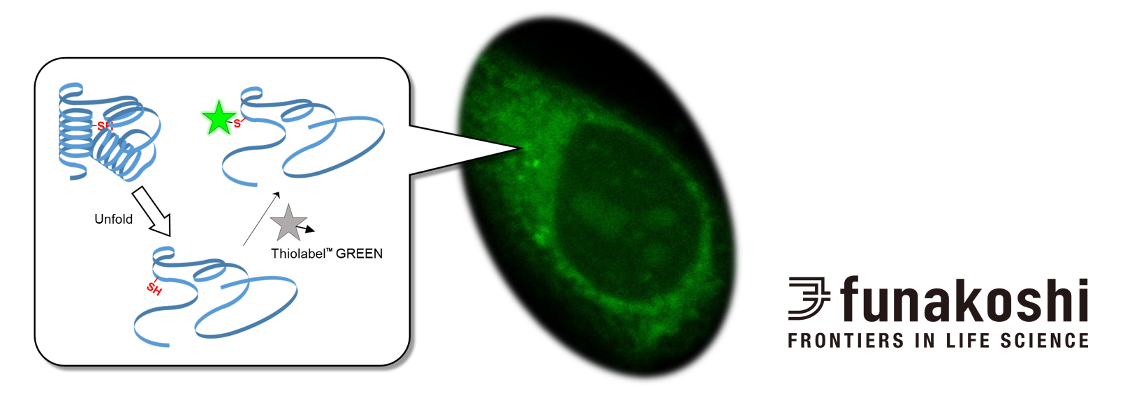 チオール基の検出や細胞内タンパク質変性の評価に有用です | ThiolabelTM GREEN <Thiol-Specific Fluorescent Labeling Reagent> | フナコシ