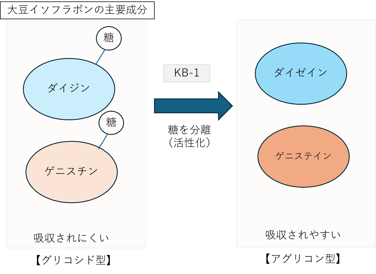 大豆イソフラボン(ダイジン、ゲニスチン等)は女性ホルモンに似た働きを持つ成分として知られていますが、通常は糖が結合した「グリコシド型」として存在しており、そのままでは体内に吸収されにくく、活性が極めて低いという課題があります。私たちは、この糖部分を分離・変換することで、極めて高い吸収性と活性を持つ「アグリコン型(ダイゼイン、ゲニステイン)」へと生成できる能力の高い菌株を探索しました。その結果、最も高い変換活性を示した「KB-1」をヒト臨床試験の対象に選定。「KB-1」が生きたまま腸に届くことで、腸内で“できたて”のアグリコン型イソフラボンを生成し、効率的に吸収させるという独自のメカニズムを確認し、有意義な試験結果が得られたことを受け、今回の新規用途特許の出願に至りました。