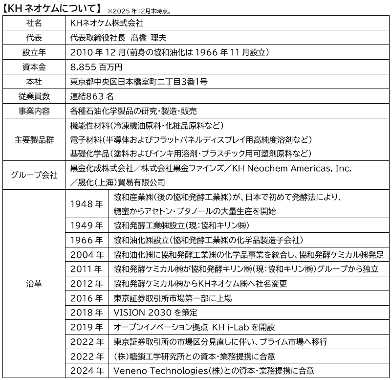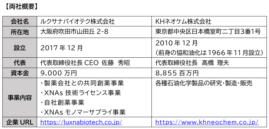 ルクサナバイオテク株式会社(本社:大阪府吹田市、代表取締役社長 CEO:佐藤 秀昭、以下 「ルクサナバイオテク」)と、KHネオケム株式会社(本社:東京都中央区、代表取締役社長:髙橋 理夫、以下「KHネオケム」)は、2026 年 3月より、新規創薬モダリティの創出を目的とした共 同研究を開始いたしましたのでお知らせいたします。