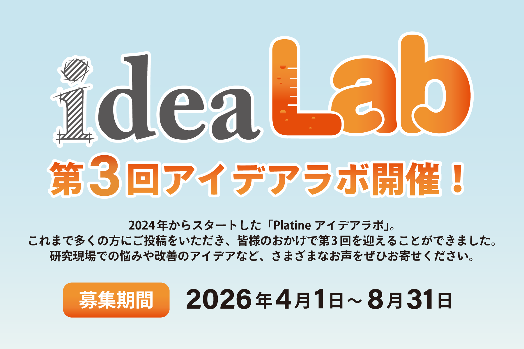 大阪のプラスチックメーカー・株式会社サンプラテック(本社:大阪市北区、代表取締役:加藤学司)は、研究現場の悩みやアイデアを公募し、製品化を実現するオープンイノベーション企画「第3回 Platine(R)(プラティーヌ)アイデアラボ」の募集を2026年4月1日(水)より開始いたしました。投稿されたアイデアに対し、最優秀賞10万円を授与するとともに社会実装を目指します。