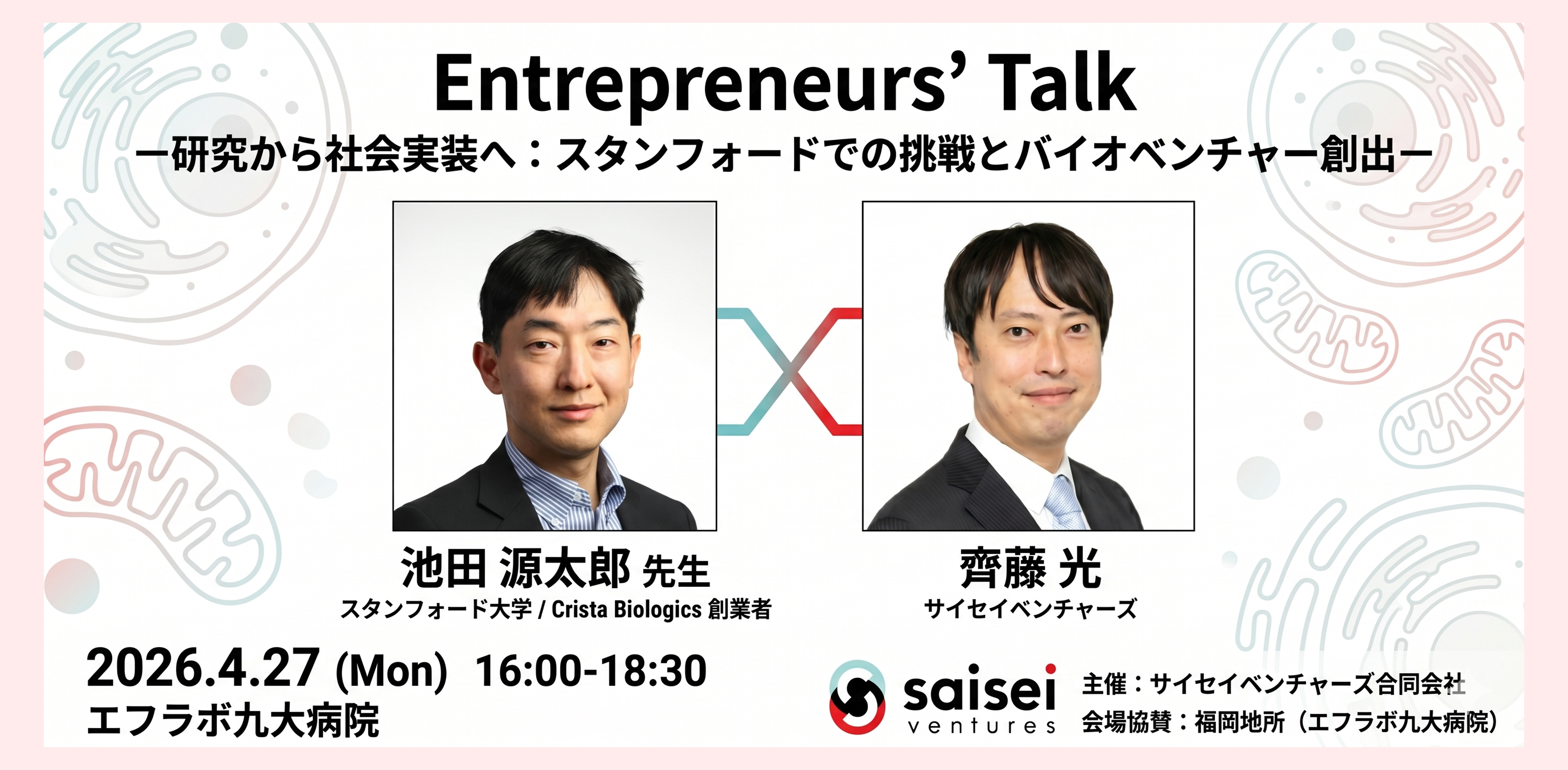 また、サイセイベンチャーズの齊藤が聞き手となり、スタンフォード大学での研究生活や、起業の経緯、日本への展開構想についてもお聞きします。