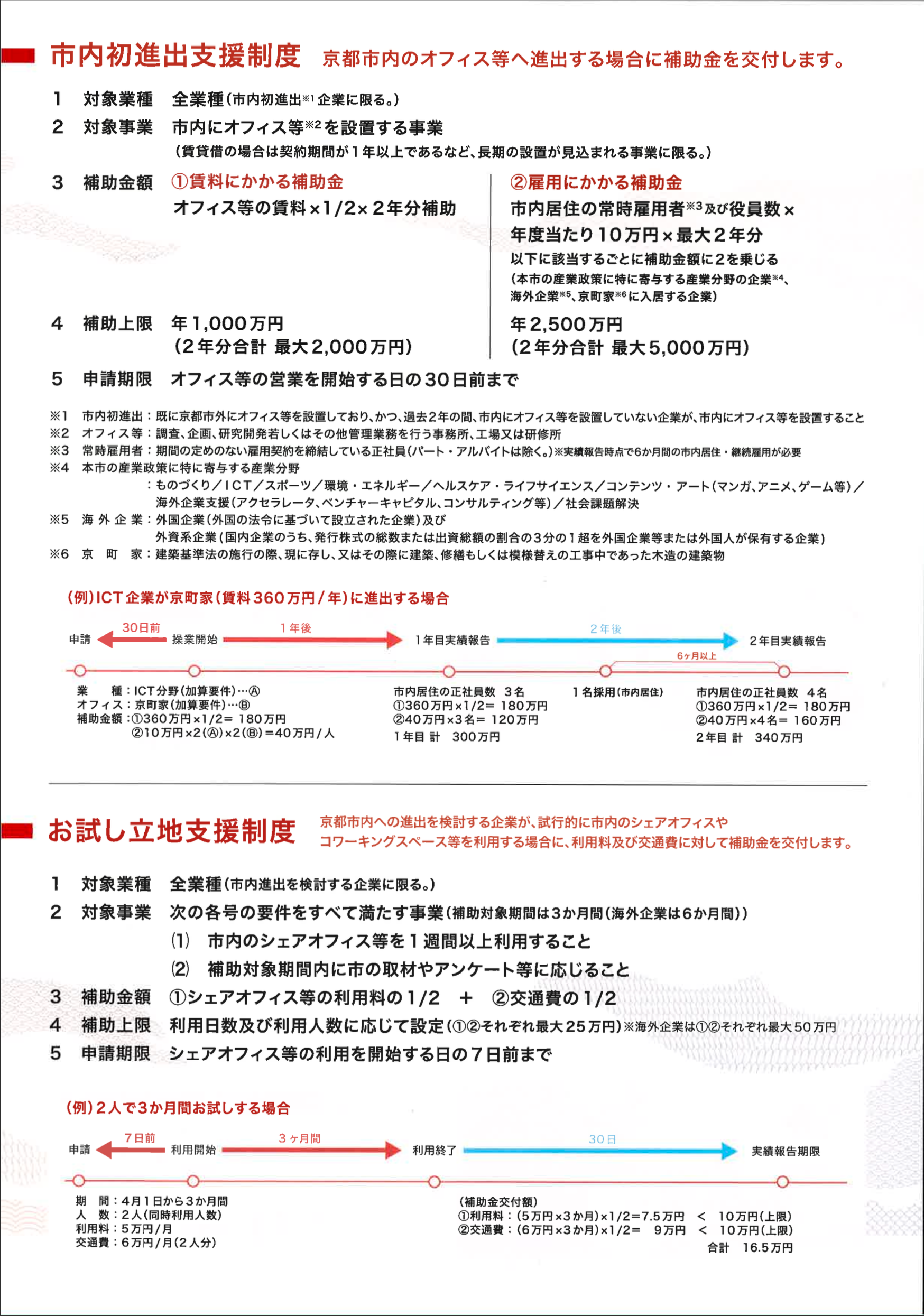 3.京都市外企業は京都市「市内初進出支援制度」の対象に(賃料×1/2×2年/最大2,000万円)