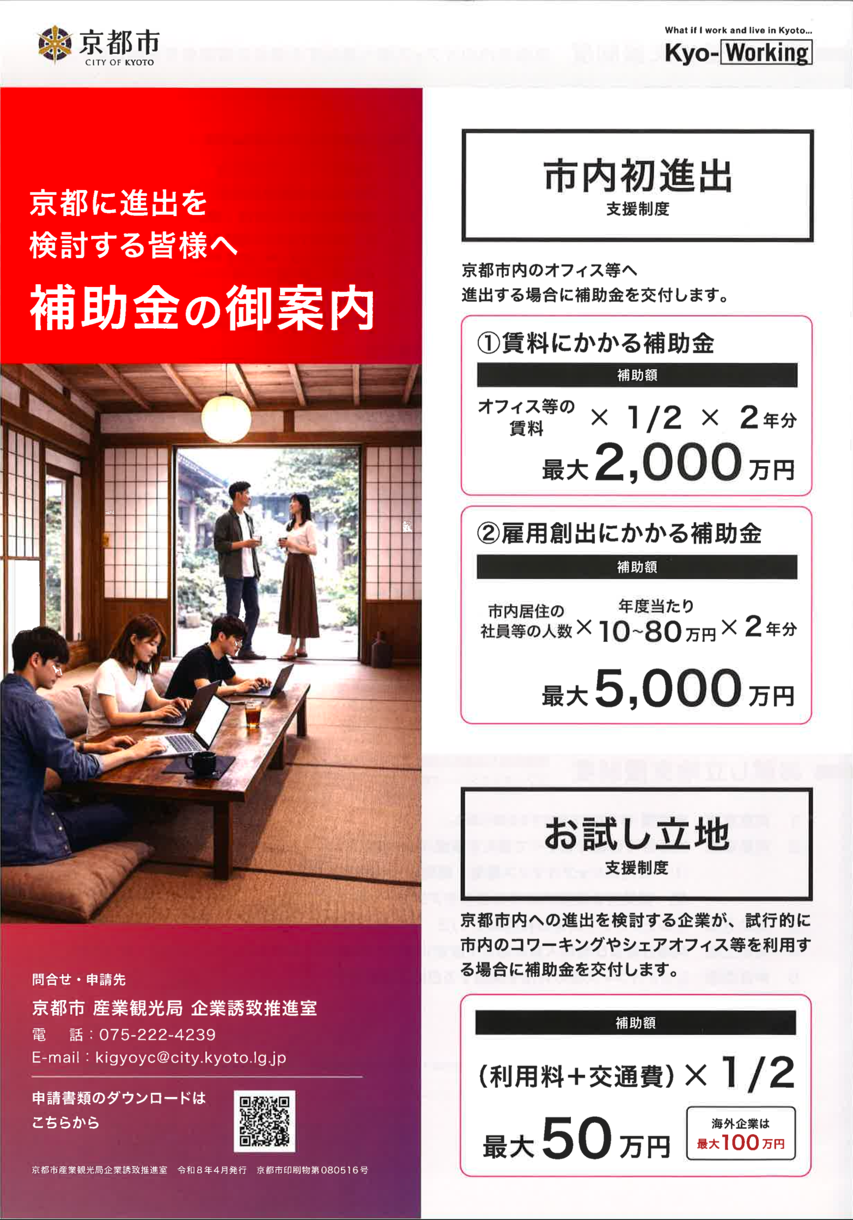 ※上記はいずれも京都市による制度の概要です。適用可否・具体的な補助額は京都市(産業観光局 企業誘致推進室 TEL:075-222-4239)の審査および要件によります。