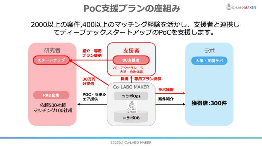 Co-LABO MAKERは研究開発のスピードと投資対効果を大幅に向上できるサービスとして、現在、全国300件以上のラボを中心に、5,000件以上の研究リソースを登録いただき、大手メーカーから一般企業、学校、団体など、400件以上のマッチングを実現しています。これまで以上に支援の幅を広げていくために「TOKYO SUTEAM」事業を活用して、ディープテックスタートアップとそれを支援する支援者(VC・アクセラレーター・大学・自治体等)向けのPoCインフラを構築いたします。