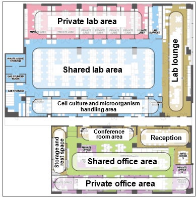 | [Wet lab area] Benches: 66 seats (planned), private lab suites, cell culture rooms, etc. [Office area] Open desks, private offices, conference rooms, etc. [Lounge area] Communication lounge, shared kitchen, wellness room, etc. Resident companies have access to a wide range of shared equipment prepared to meet the needs of startups in the seed and early stages. |