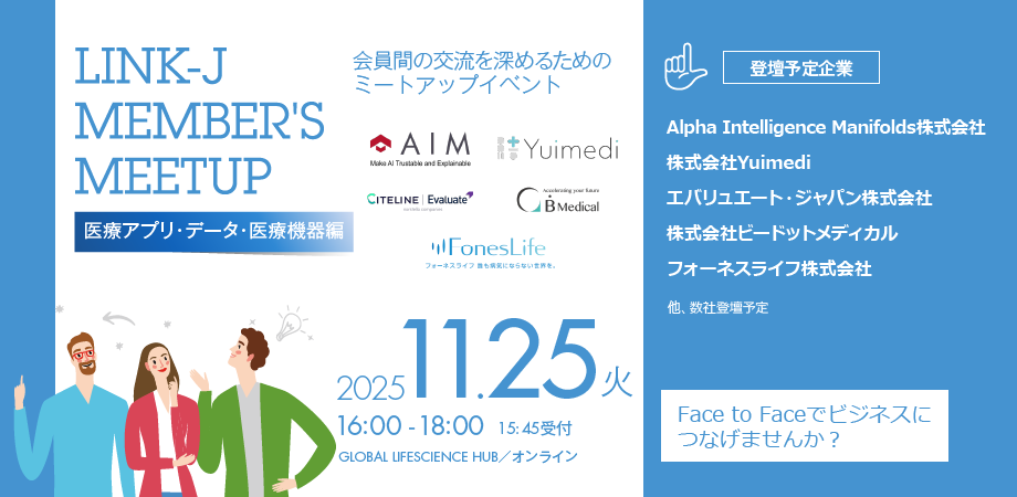毎回テーマ(2025年年間予定のお知らせ:ミートアップイベント『LINK-J Member's Meetup』 | ニュース | LINK-J)を設けて開催しており、今回は「医療アプリ・データ・医療機器」です。事業内容、取組みのプレゼンテーション後、リアル会場のみネットワーキングタイムのお時間も設けておりますので、ぜひLINK-J会員同士の交流を深めていただければと思います。