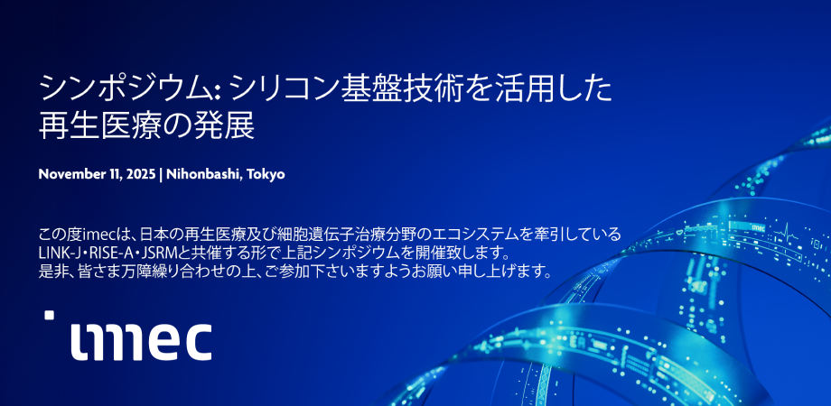 この度imecは、日本の再生医療及び細胞遺伝子治療分野のエコシステムを牽引しているLINK-J・RISE-A・JSRMと共催する形で上記シンポジウムを開催致します。本シンポジウムにおきましては、imecが培って参りましたデータドリブン、且つ自動化された、高精度なワークフローを持つ統合されたシステムを、日本の再生医療を代表される皆さまにご紹介申し上げます。