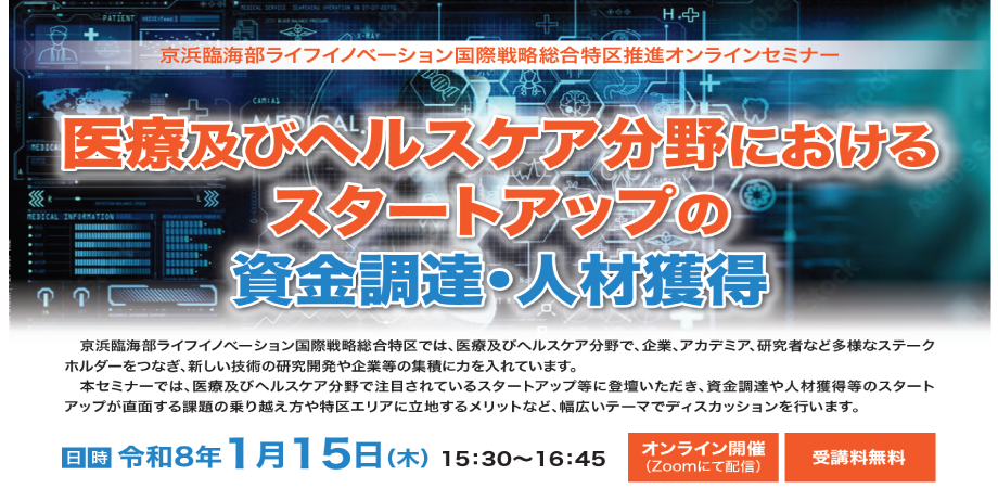本セミナーでは、医療及びヘルスケア分野で注目されているスタートアップ等に登壇いただき、資金調達や人材獲得等のスタートアップが直面する課題の乗り越え方や特区エリアに立地するメリットなど、幅広いテーマでディスカッションを行います。
