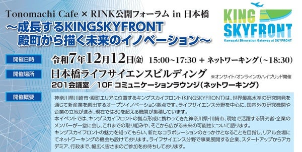 今回のTonomachi Cafeは、かながわ再生・細胞医療産業化ネットワーク(RINK)とコラボレーションした公開フォーラムを日本橋ライフサイエンスビルディングで開催します。