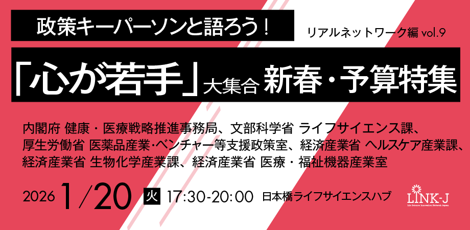 今回はvol.9として新年にふさわしく、内閣府、厚労省、経産省、文科省などライフサイエンス関連主要省庁のみなさまから「補正予算や新年度予算案」のポイントを中心として今後の取組や展望等を共有いただき、さらにみなさまと相互交流を深めていただきます。