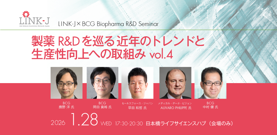 | 17:30 | 開会挨拶 曽山 明彦(LINK-J 常務理事、東北大学特任教授) 中村 健 氏(ボストン・コンサルティング・グループ マネージング・ディレクター&パートナー) |