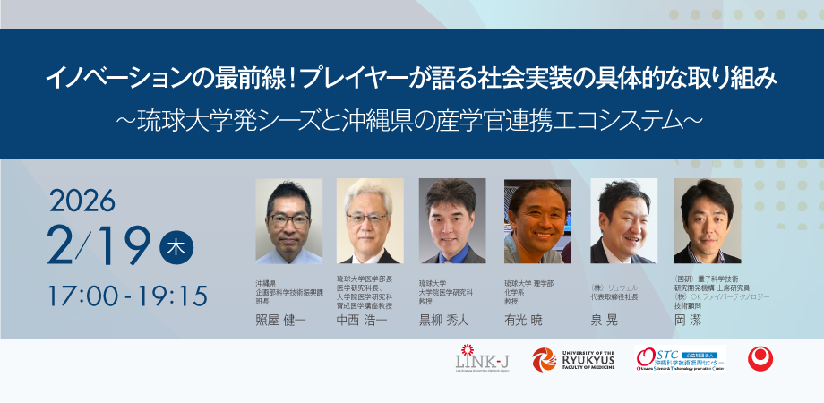 今回LINK-Jは琉球大学と初めてイベントを共催し、沖縄・琉球大学発の具体的な創薬・ヘルスケアシーズを紹介します。