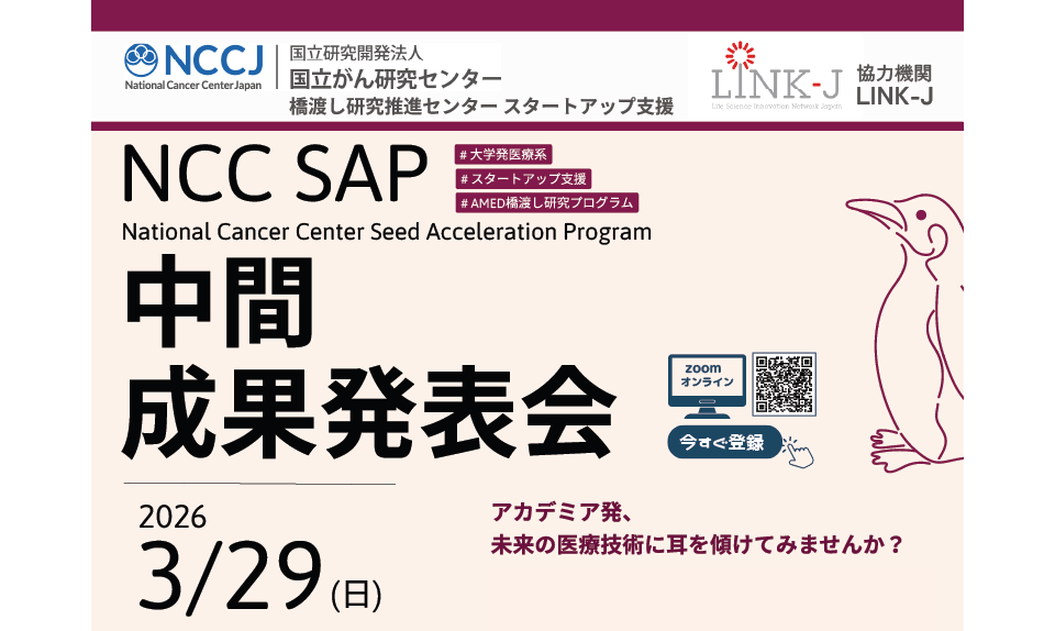 国立がん研究センターSeed Acceleration Program (NCC SAP) は、革新的医療技術を開発するスタートアップ候補を全国から公募し、国立がん研究センターが支援・育成するプログラムで、AMED大学発医療系SU支援事業に選定されています。