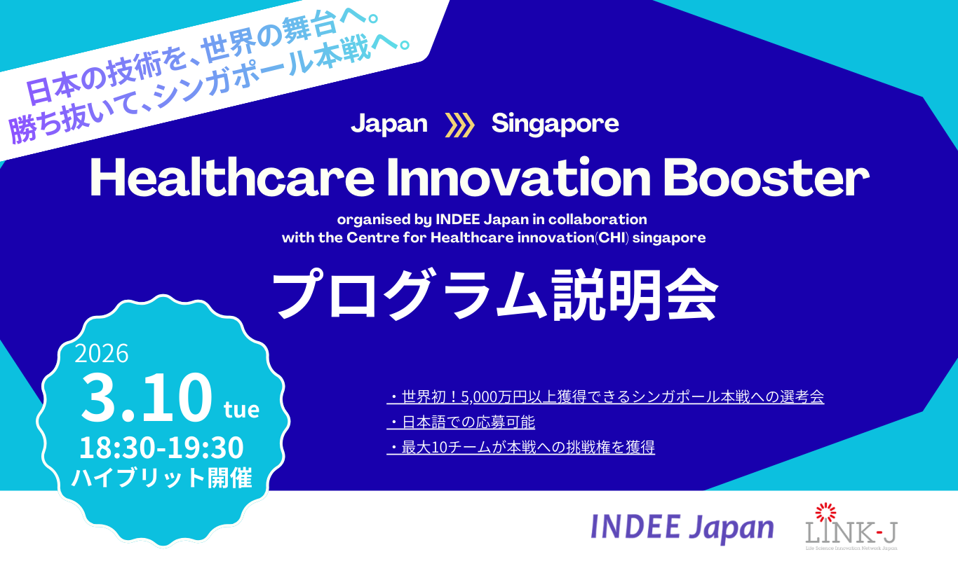 | 19:00–19:10 | Healthcare Innovation Booster プログラム説明 INDEE Japan 橋本 奈央 |