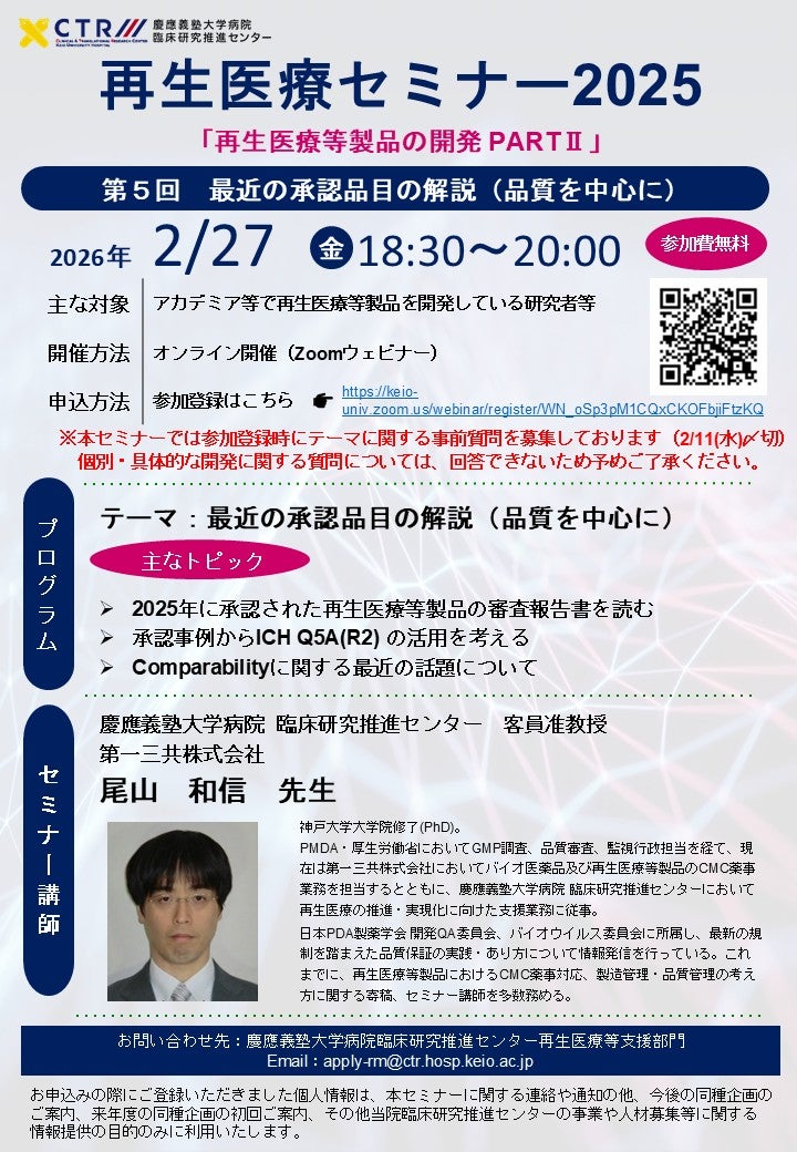 再生医療・細胞治療の設計から製造までに関わるCMC業務を行える人材を育成する社会人向けコースです。再生医療事業(細胞製造)を行う企業の開発部門・製造部門・信頼性保証部門等に所属する方、規制の知識を深め、細胞加工物の研究・開発の流れを学びたい方を対象としています。コース終了後は大阪大学未来医療センターの見学会に参加可能です。