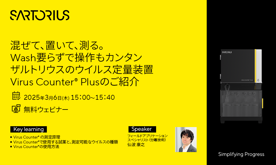 ウイルスベクターの開発やワクチン製造において、迅速かつ正確なウイルス定量は、プロセスの最適化と品質管理に不可欠です。本ウェビナーでは、ザルトリウスの革新的なウイルス定量装置 Virus Counter® Plus をご紹介します。