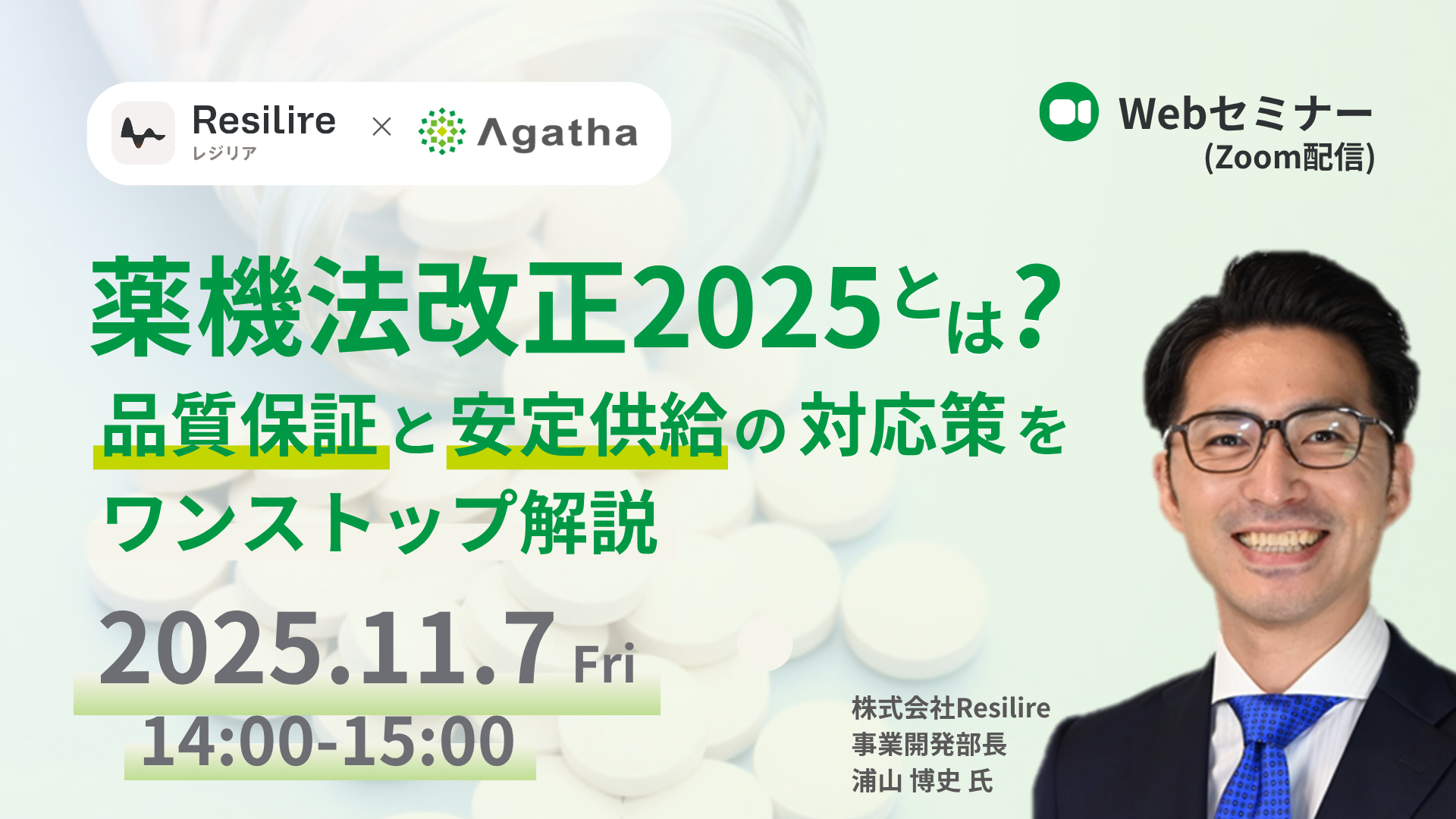本Webinarでは、文書・品質管理領域に強みを持つアガサと、サプライチェーン管理や安定供給の実現をサポートする株式会社レジリアが共催し、薬機法改定を背景に現場で想定される課題を整理。そのうえで、各社のソリューションで、品質管理及び安定供給を支援する具体的な方法についてご紹介いたします。