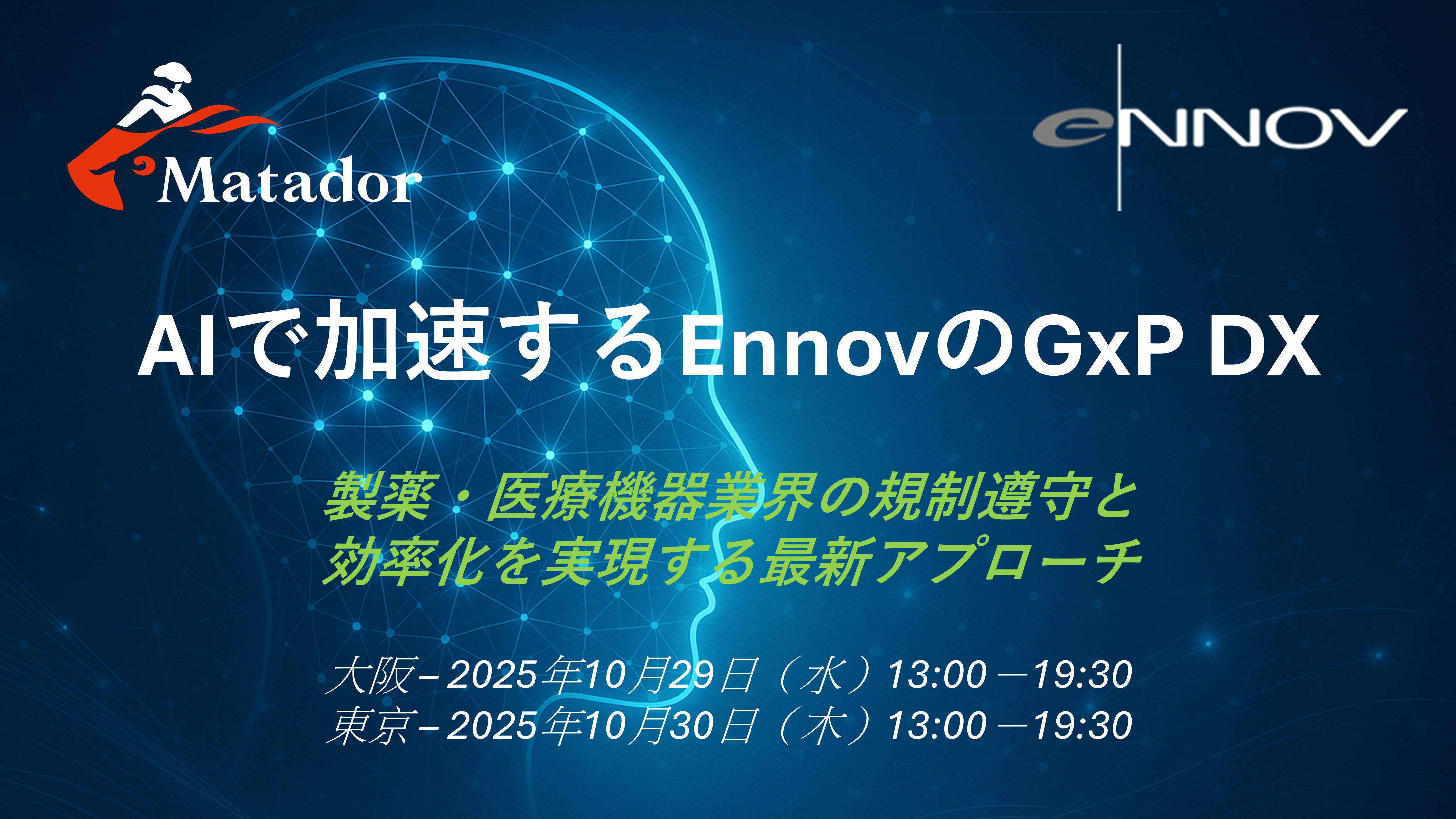 マタドールジャパン株式会社は、Ennov 社製品・サービスの日本における正規販売代理店となりました。Ennov は薬事、品質、臨床、安全性・市販後調査の各領域においてグローバルで高い信頼を得ており、世界 450 社以上のライフサイエンス企業に導入されています。今回のパートナーシップを通じて、Ennov の世界的な専門性と、日本のお客様のニーズをつなげてまいります。