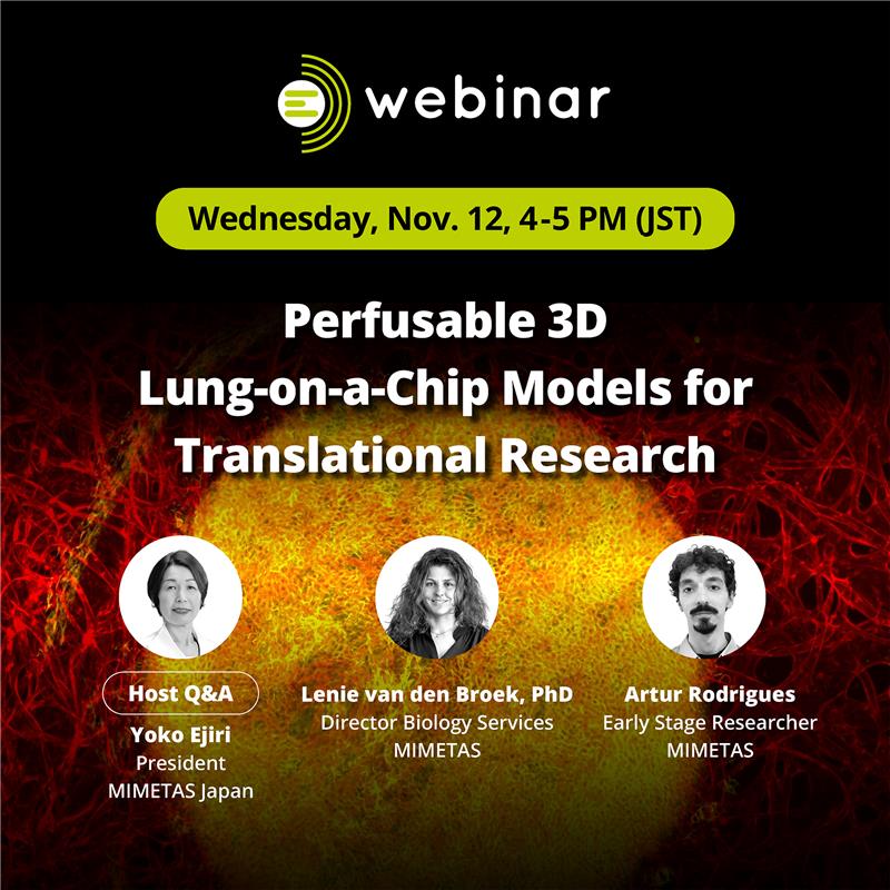 At MIMETAS, we develop Airway-on-a-Chip (AoC) models that recapitulate characteristic processes of healthy and diseased states of the human lung. Join our live webinar on Wednesday, November 12, 2025, with Lenie van den Broek (Director Biology Discovery, MIMETAS) and Artur Rodrigues (Early Stage Researcher, MIMETAS) to explore how our lung models are transforming respiratory research and high-throughput drug testing, with a focus on our newest model, integrating unidirectional flow, perfusable microvascular networks and differentiated airway epithelium. Yoko Ejiri (President MIMETAS Japan) will host the Q&A session.