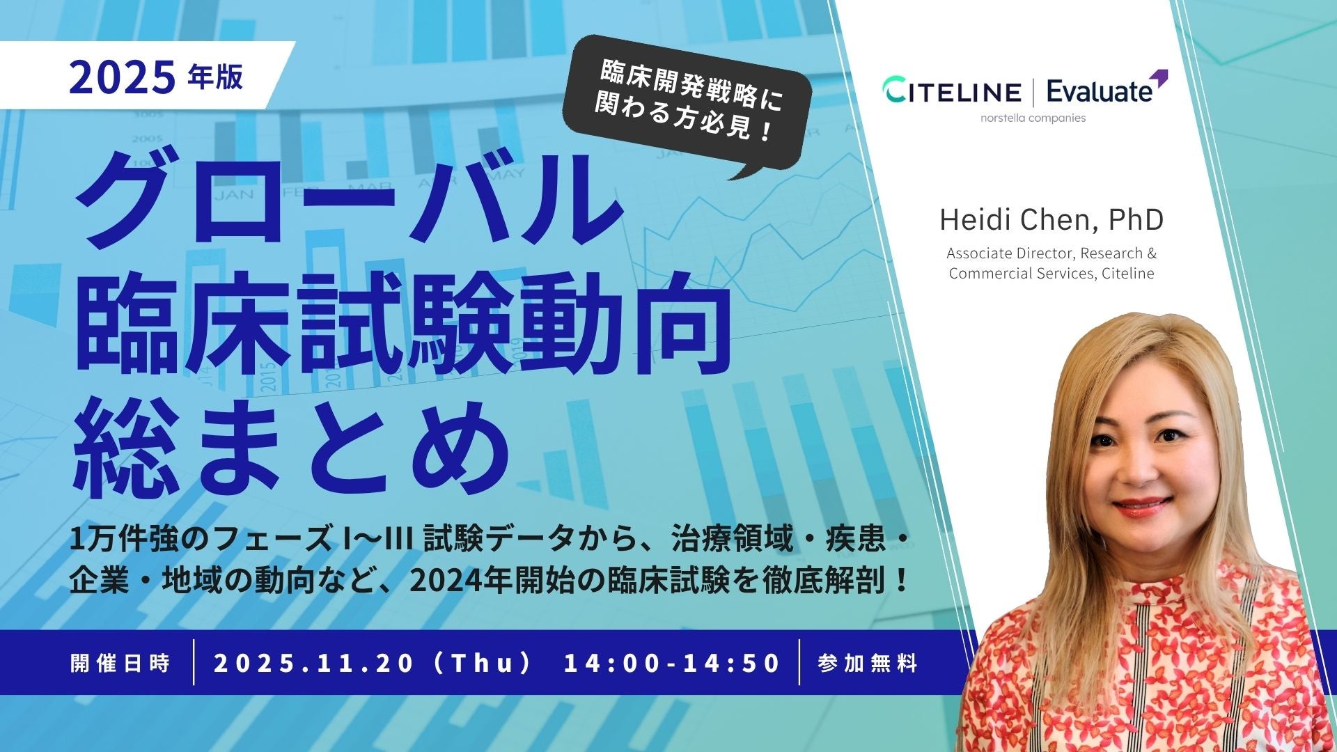 本ウェビナーでは、2024年に実施された10,503件の第I~III相臨床試験のデータをもとに、業界主導試験の3.6%増を含む、全体で5.5%の成長を遂げた臨床試験のグローバル最新トレンドを解説。無料でご参加いただけますので、是非下記よりお申込みください!