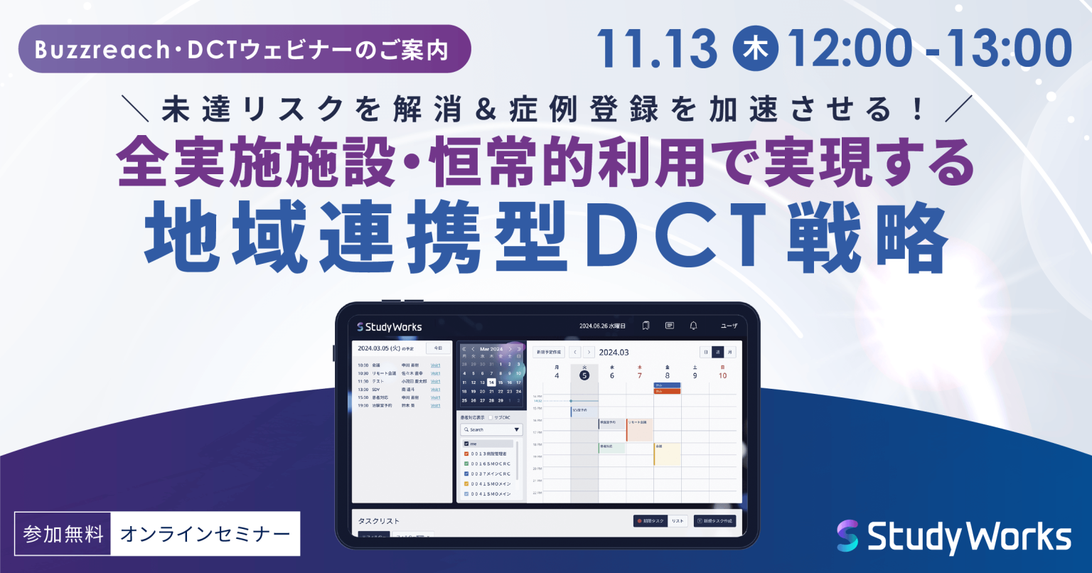 Buzzreachでは、この度、『未達リスクを解消】症例登録を加速させる!全実施施設・恒常的利用で実現する「地域連携型DCT」戦略』と題し、第2回目となる無料ウェビナーを開催する運びとなりましたので、ご案内申し上げます。