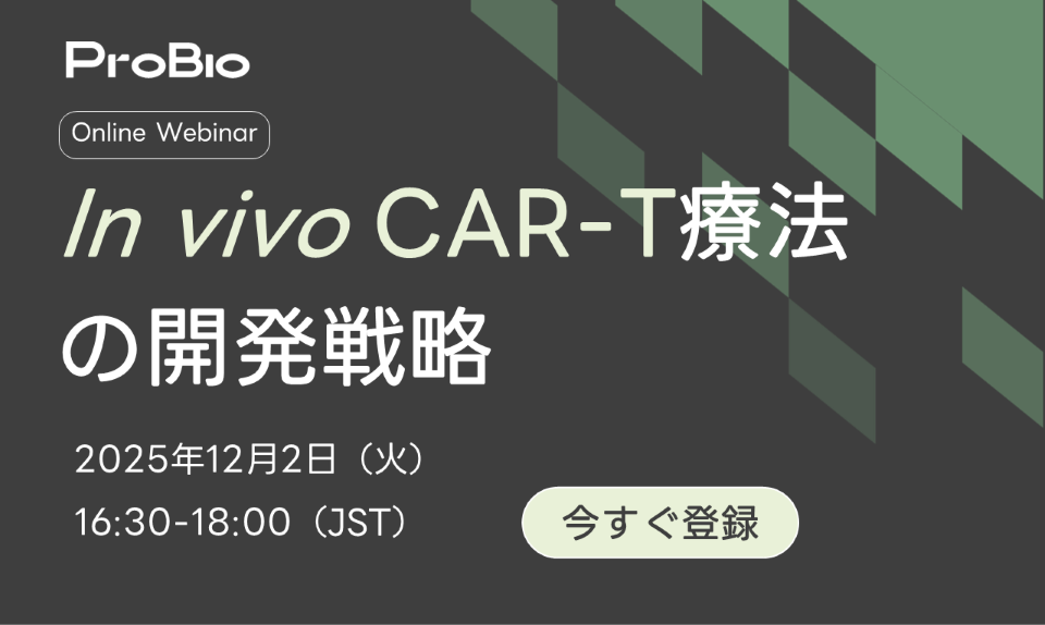 CAR-T療法は血液がん治療に革新をもたらしましたが、従来の体外製造プロセスは依然として高コストかつ時間を要する点が課題となっています。次世代の in vivo CAR-Tは、LVV(ウイルスベース)およびLNP(非ウイルスベース)の2つのデリバリープラットフォームによって、こうした課題の解決に向けて大きく前進しています。 本ウェビナーでは、LVVおよびmRNA-tLNP技術がどのように in vivo CAR-T療法の産業化を加速しているかについて、最新の知見と実例を交えてご紹介します。