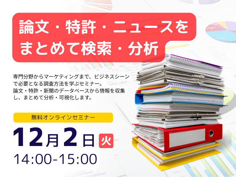 データベースサービスを活用した学術文献の調査をご体験いただけるセミナーです。調査の流れや検索した結果のグラフ化など、データベース活用方法を実習形式でご紹介します。