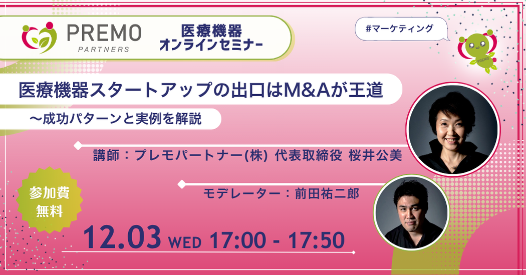 本イベントでは、外資系メーカーで13年、医療機器特化インキュベーターとして6年にわたり最前線を歩む桜井公美氏が、最新データと豊富な実例から「なぜM&Aが医療機器産業の主流になっているのか」「大企業はどんなベンチャーを狙っているのか」「日本発スタートアップが世界で勝つために必要なこと」について、事例をもとに徹底解説します。